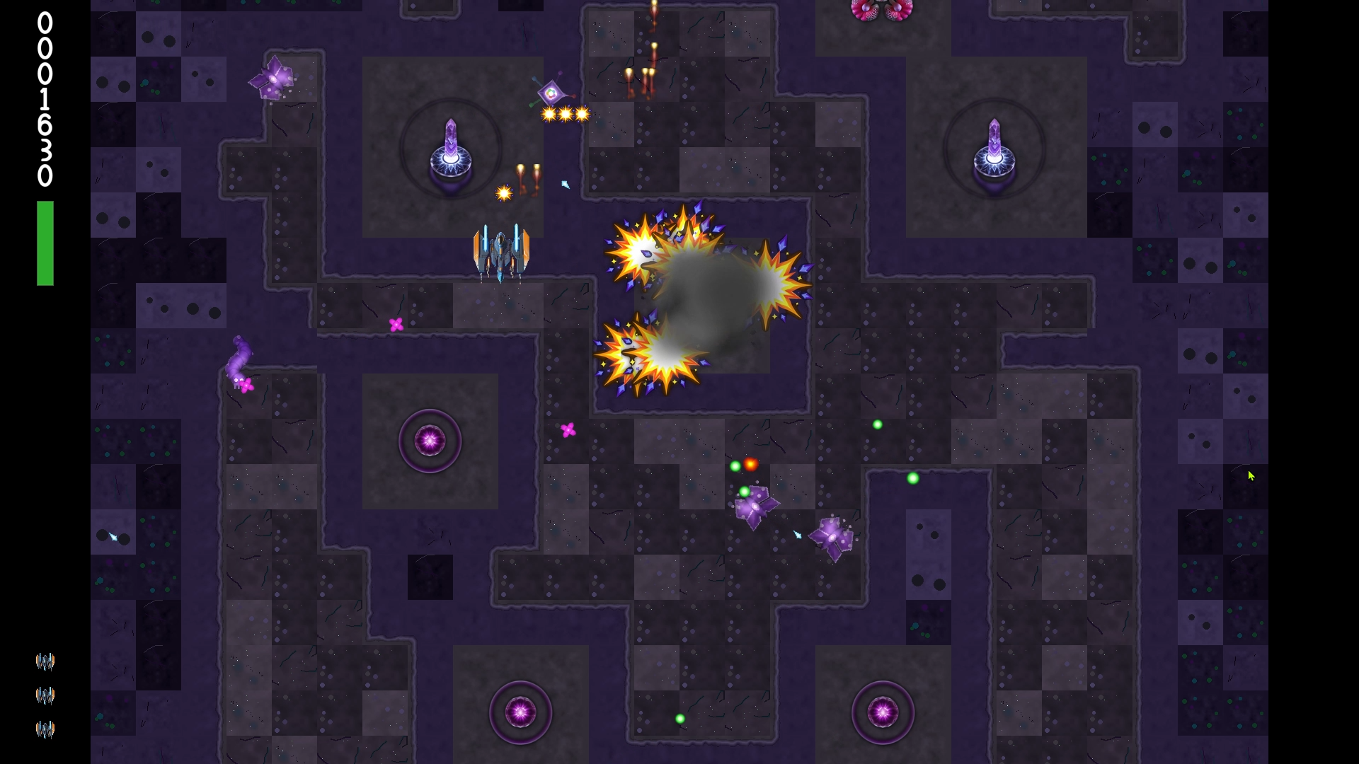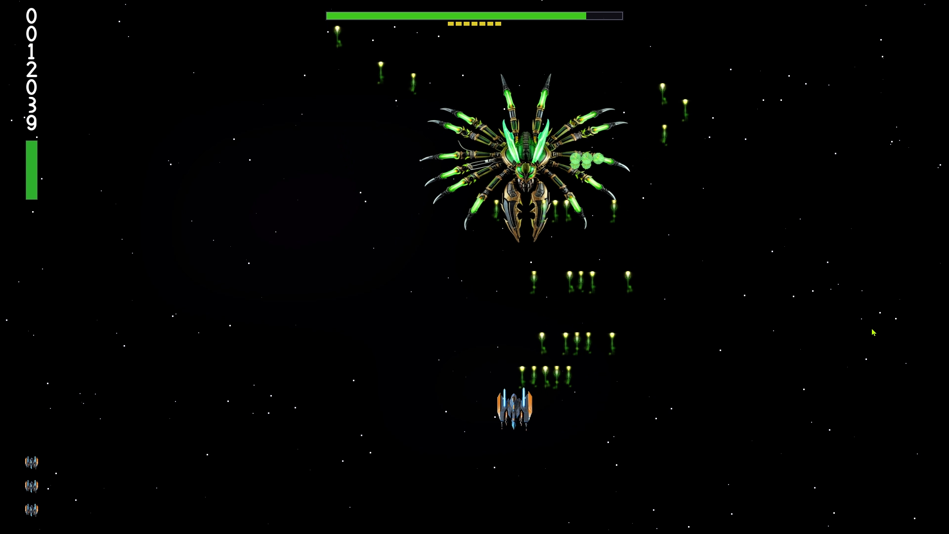 - Epic 3-phase final boss fight — destroy an alien creature limb by limb as it sweeps, dives, and charges in a starfield arena