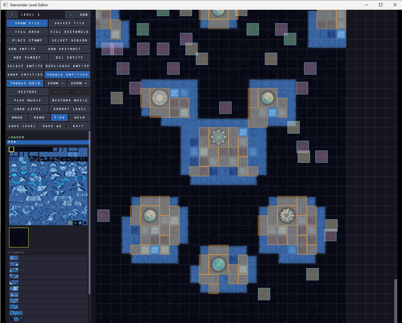 StarWinder includes a full-featured level editor. Design your own levels with custom tile maps, place enemies and obstacles, set music tracks, and share your creations. The editor ships with the game — no extra tools needed.